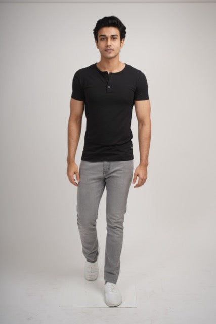 Sleek Fit- Henley Neck Short Sleeve- Charcoal Black